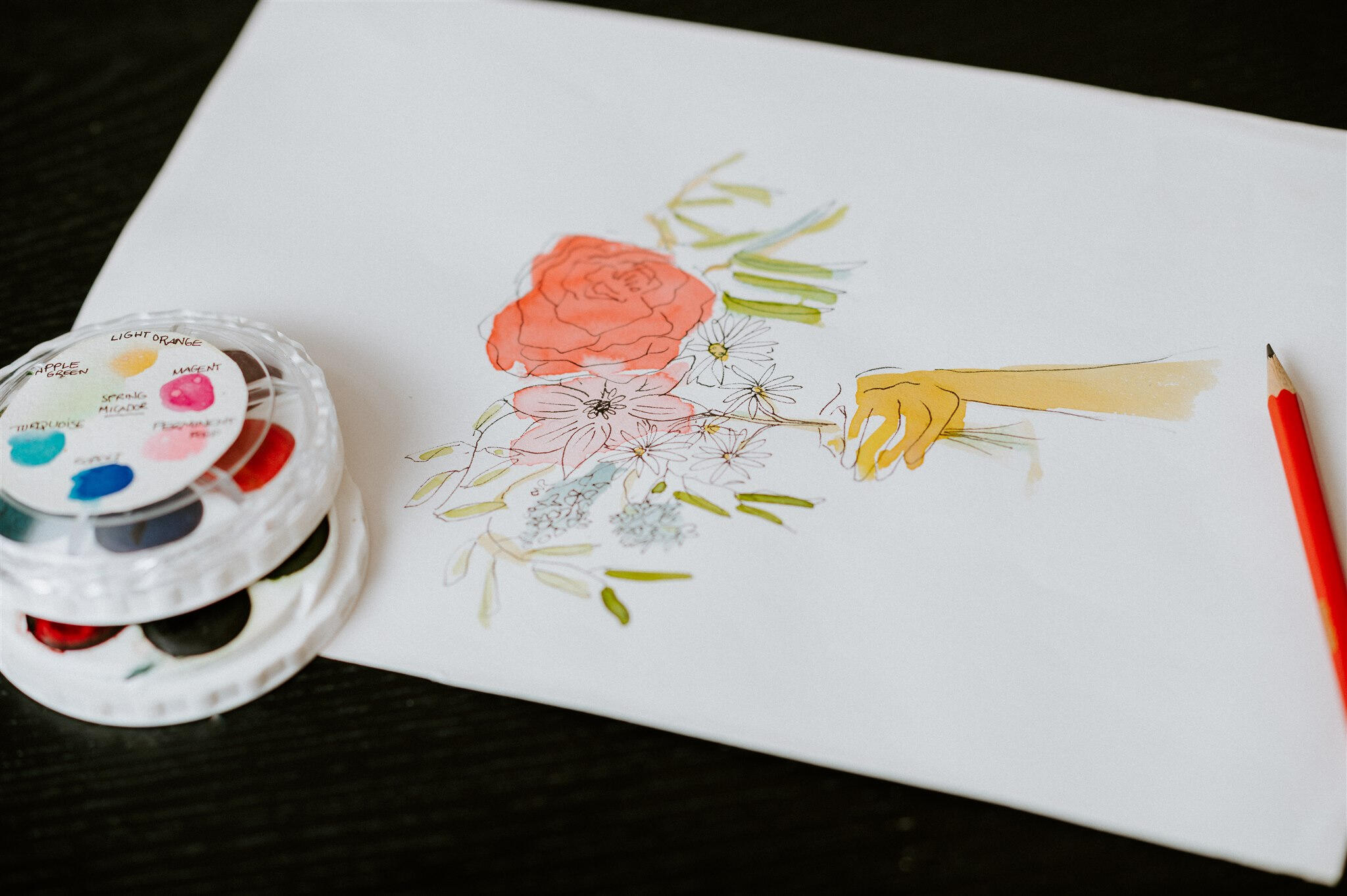The heart of these workshops is to make art accessible. I want the student leaving knowing that with a few simple rules, and inexpensive materials, they can make unique art which reflects their personality and creative style. We use an ink pen to make shapes, and then apply some water colour.
